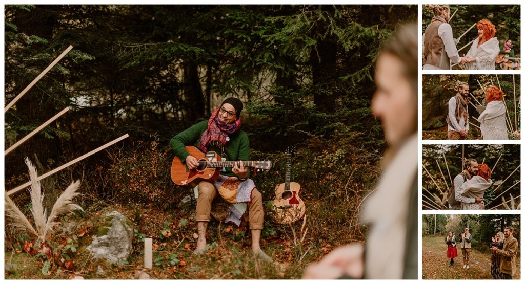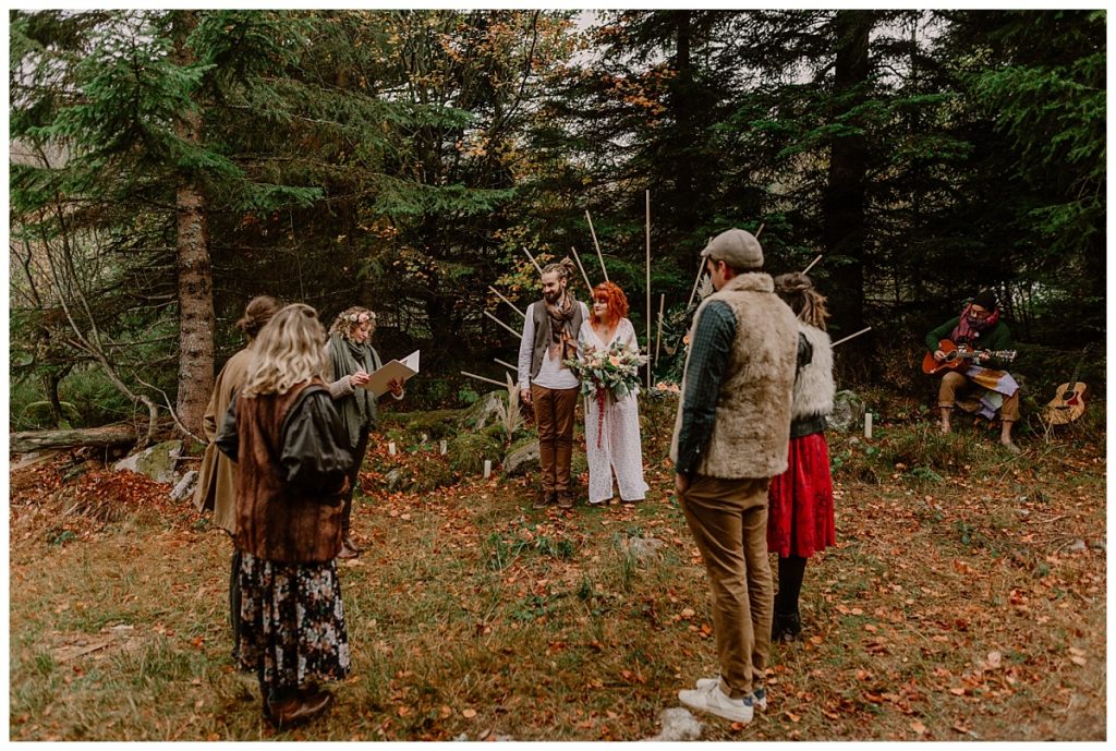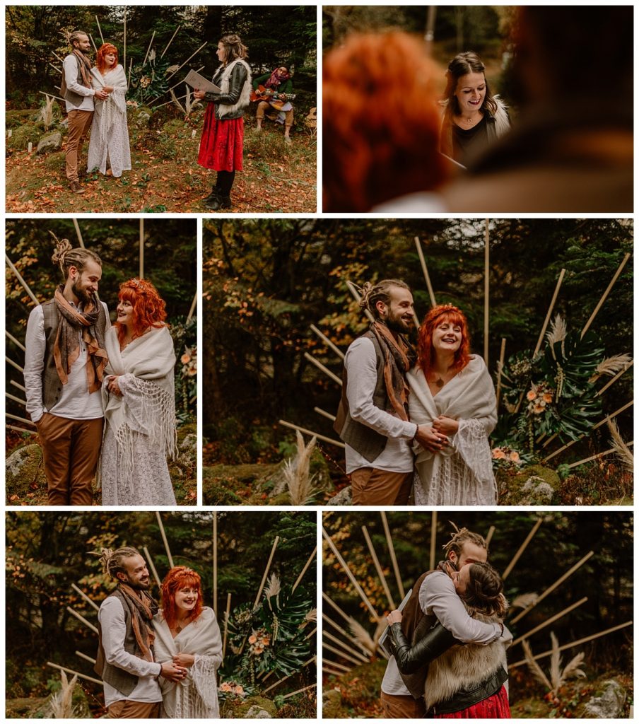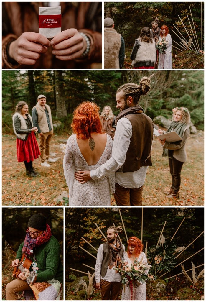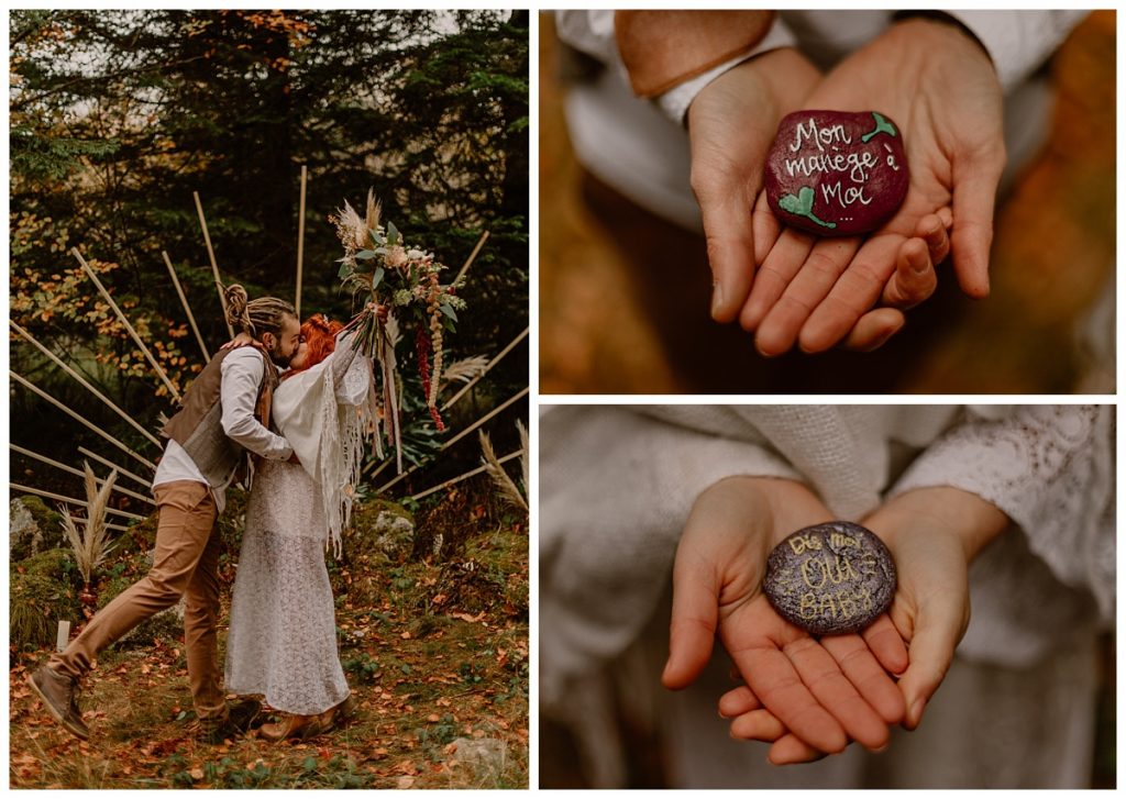 Et pour le côté Folk ? Une cérémonie en musique, une arrivée sous la neige (bon, c’est petits bouts de Pampas, OK mais il a neigé plus tard ! ) un rituel sur le voyage, un échange de cailloux avant un symbole plus (très) permanent. Les cailloux c’est adorable parce que c’est ce que Clément donnait à Jenna lors de leurs premiers dates. (ouioui mon cœur a fondu)