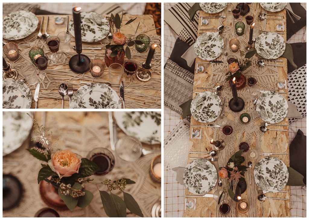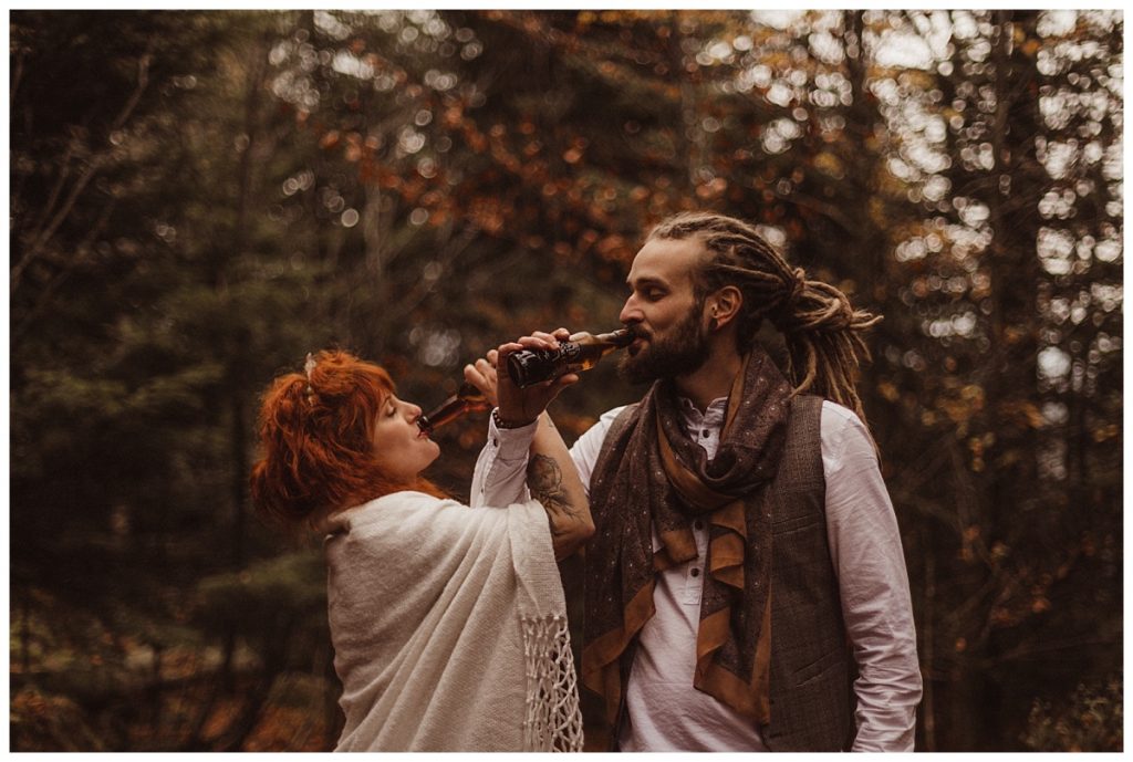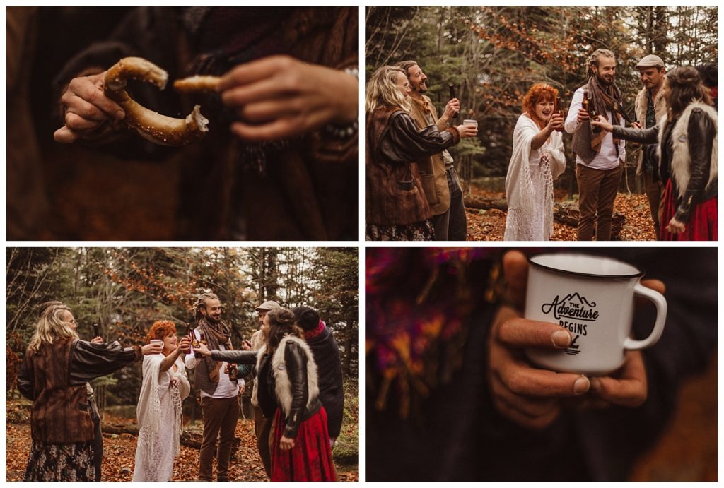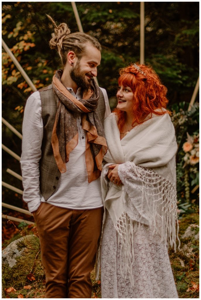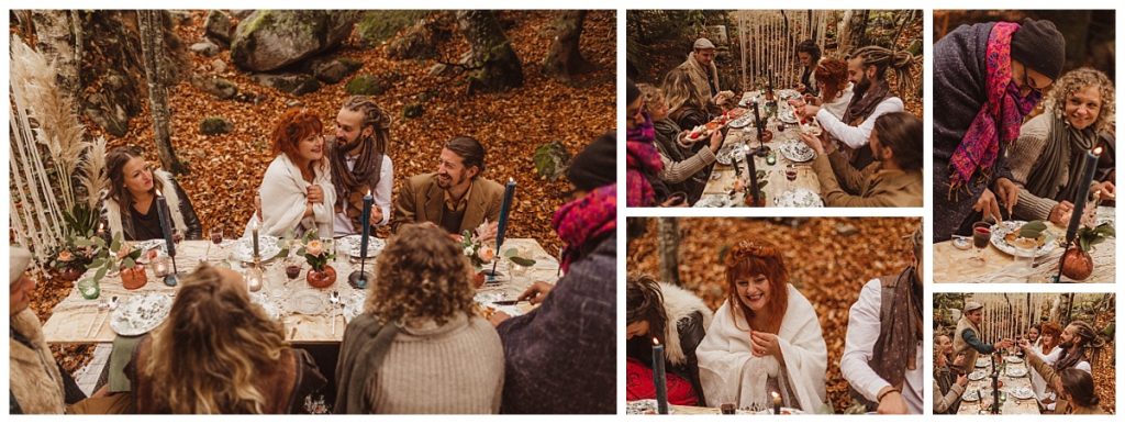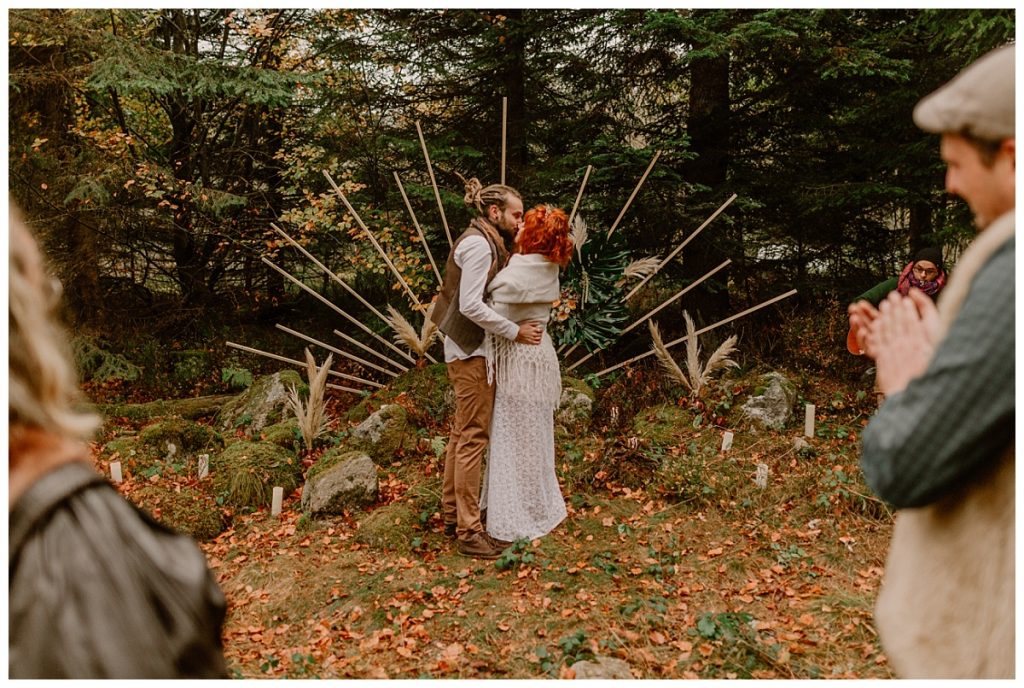 Et pour le côté Folk ? Une cérémonie en musique, une arrivée sous la neige (bon, c’est petits bouts de Pampas, OK mais il a neigé plus tard ! ) un rituel sur le voyage, un échange de cailloux avant un symbole plus (très) permanent. Les cailloux c’est adorable parce que c’est ce que Clément donnait à Jenna lors de leurs premiers dates. (ouioui mon cœur a fondu)