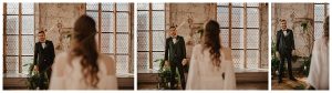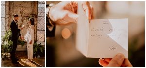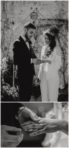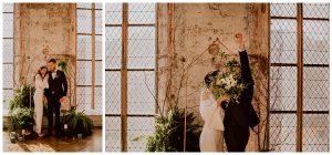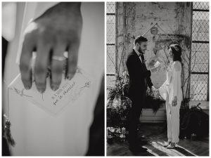 Une cérémonie d’engagement organisée autour des fenêtres du cœur supérieur des Dominicains, une arche cuivrée qui tranche joliment avec l’aspect très brut des murs en pierre et avec la fougère qui vient végétaliser l’ensemble. Théa&Léon s’échangent des alliances éthiques (et canon !) faites par un couple de joaillier de Strasbourg, Flore&Zephyr.