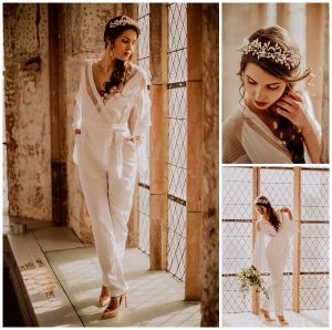 La combi-pantalon Elisa Ness pour une mariée BADASS adoucie par une belle couronne Maison Sabben !
