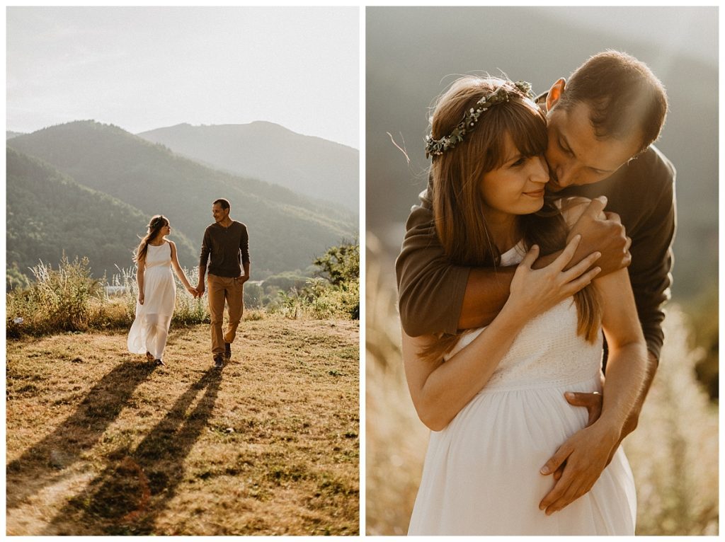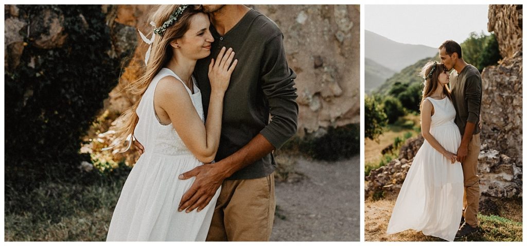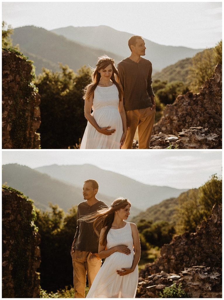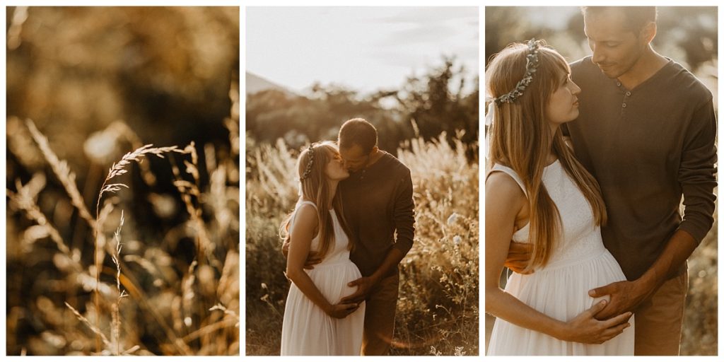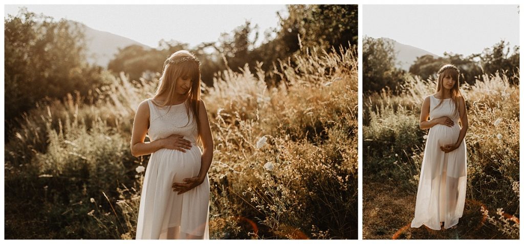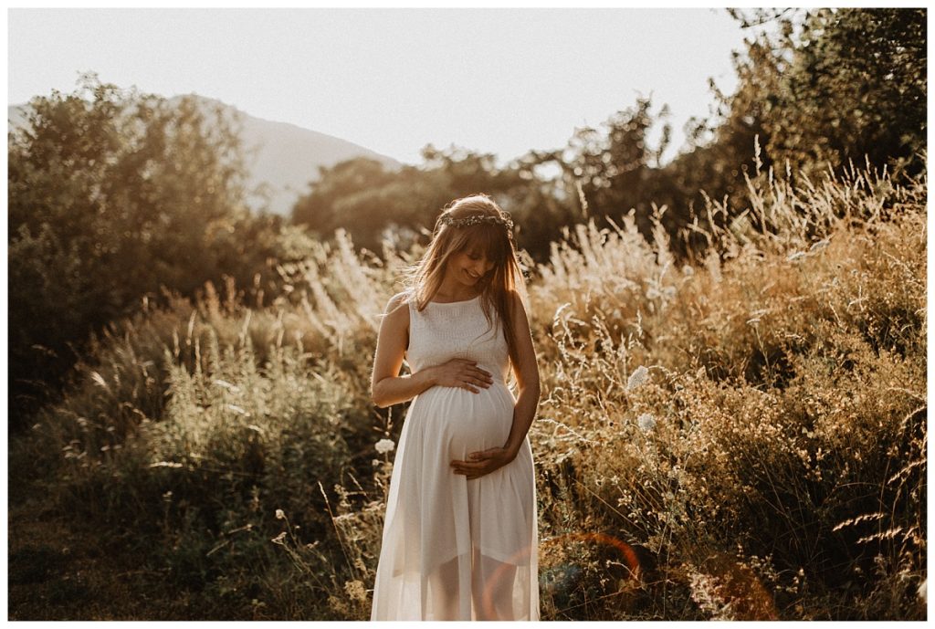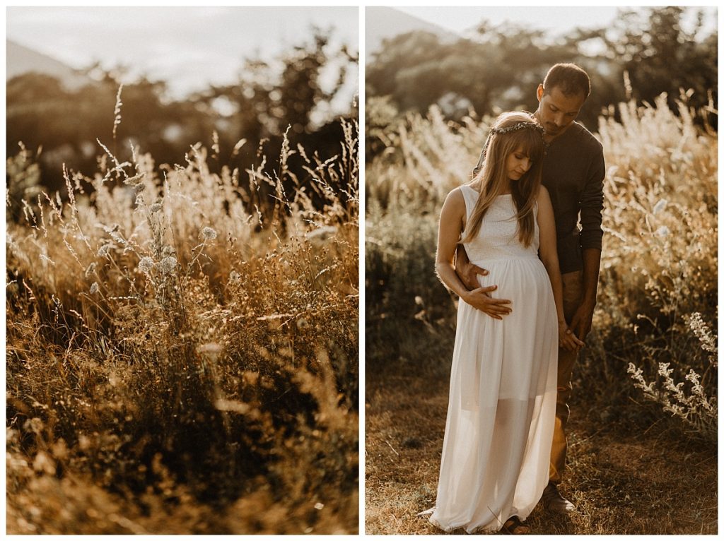 So, it’s at the end of the day that I meet Gwen & Eli for this folk & boho pregnancy session. Moreover, beautiful wreath of flowers and a beautiful dress enhance Gwen’s cute baby bump.